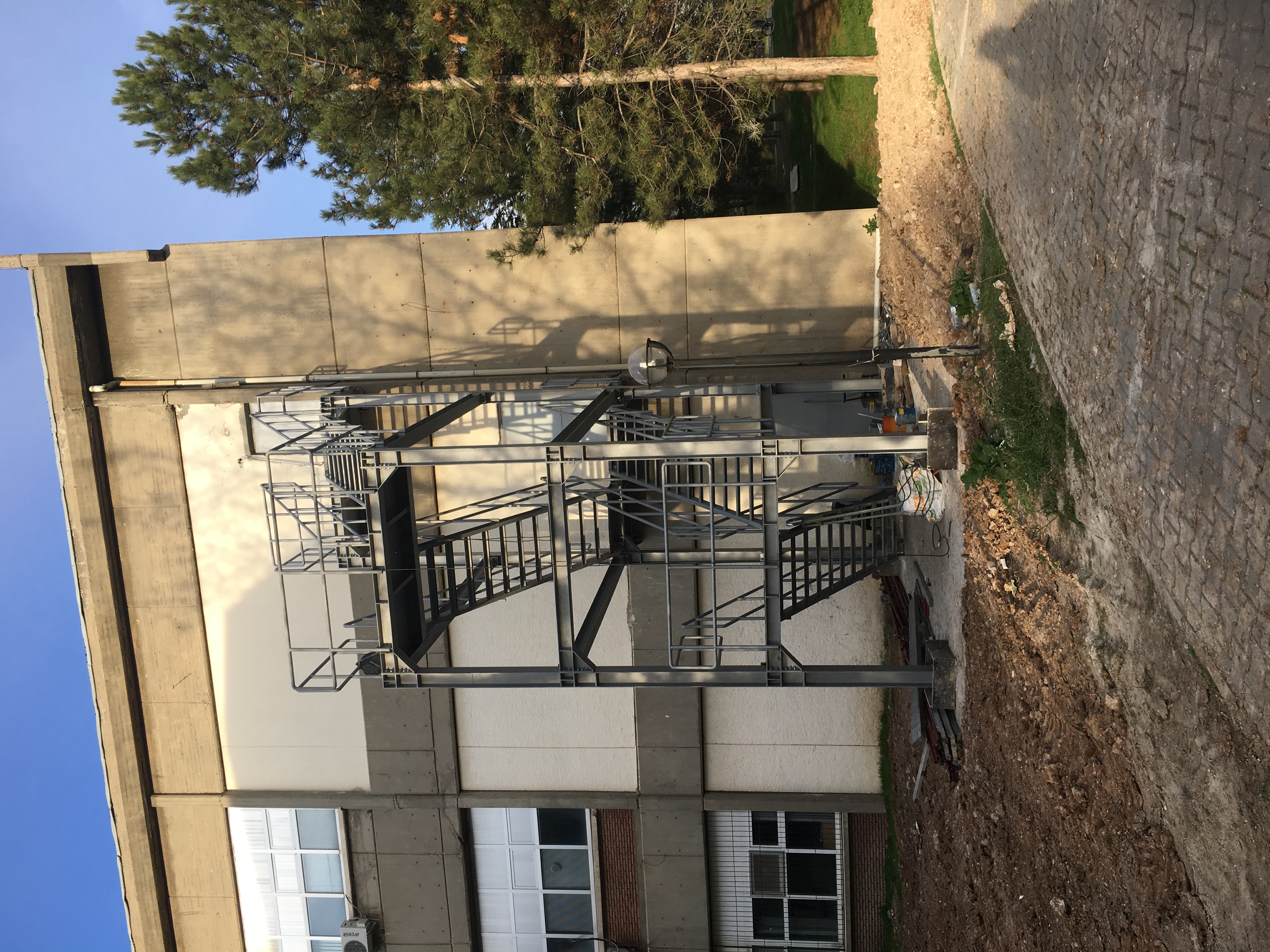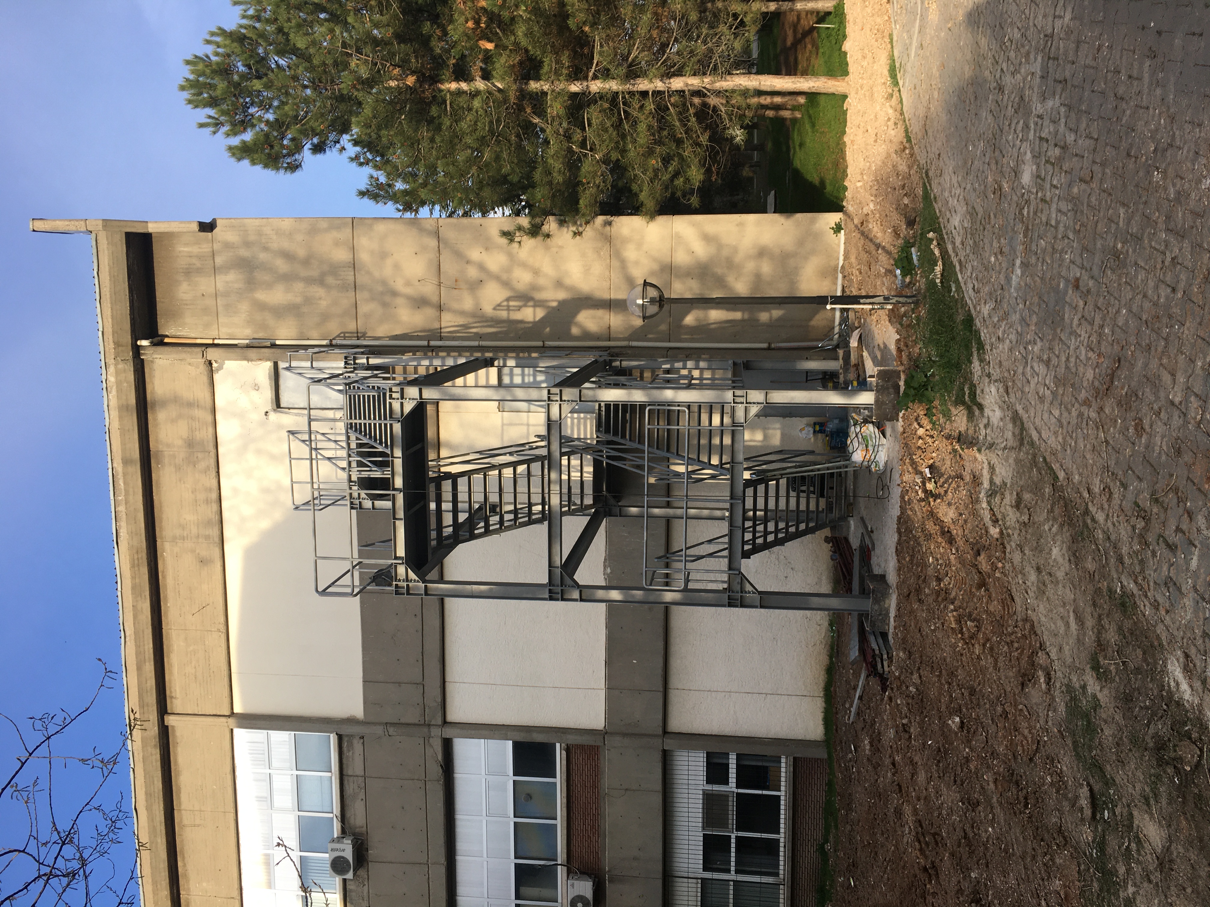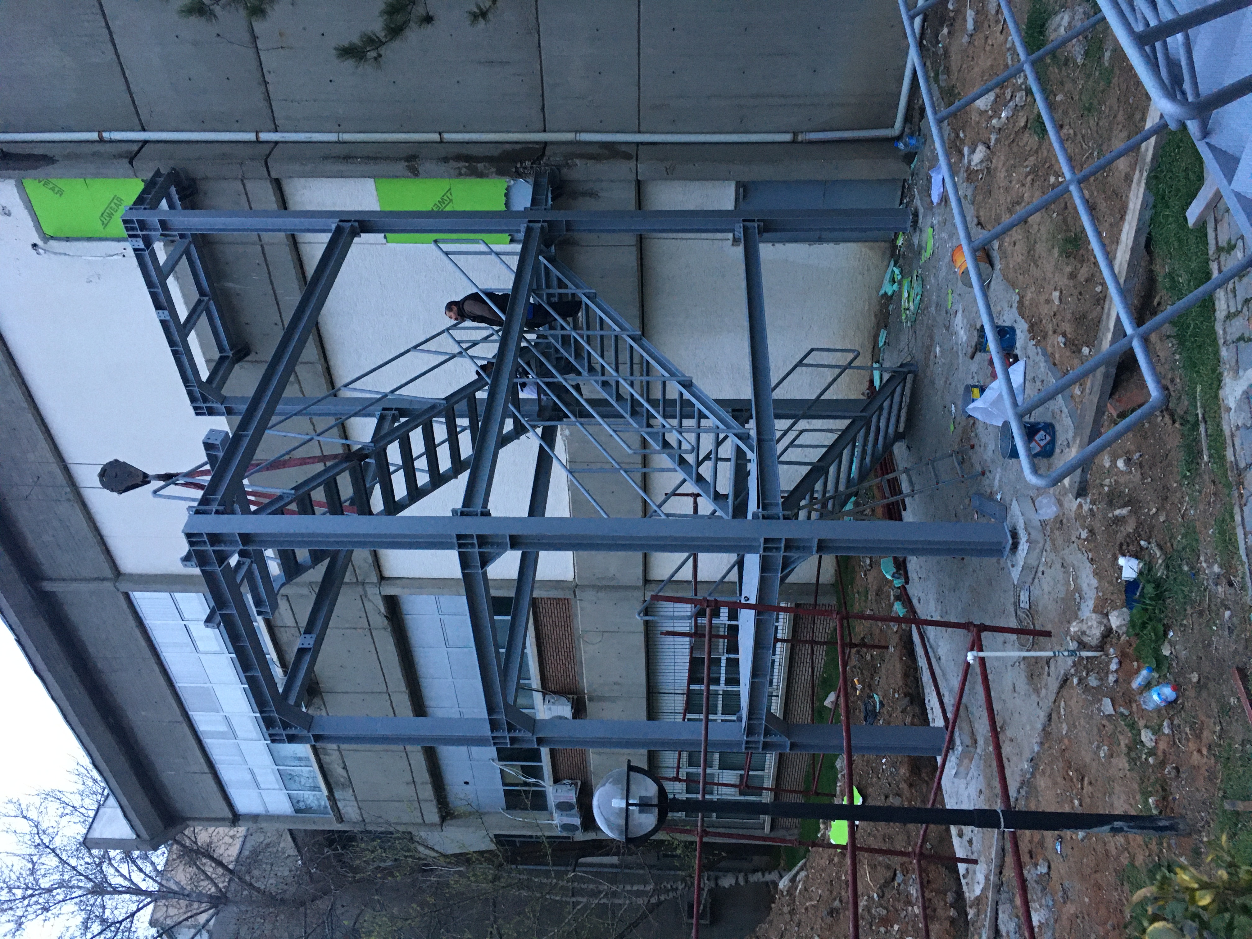 ODTÜ yerleşkesinde gerçekleştirilen yangın merdiveni projesi kapsamında, mevcut yapıya güvenli bir kaçış hattı oluşturmak için çelik taşıyıcı sistemden oluşan yeni bir dış merdiven inşa edilmiştir. Projede temel imalatları tamamlandıktan sonra katlara erişimi sağlayan çelik platformlar, merdiven kolları ve korkuluk sistemleri sahada özenle monte edilmiştir. Yapıya uyumlu, dayanıklı ve uzun ömürlü bir çözüm sunan bu çalışma, acil durumlarda binanın tahliye kapasitesini artırmayı ve güvenliği en üst düzeye çıkarmayı amaçlamaktadır.